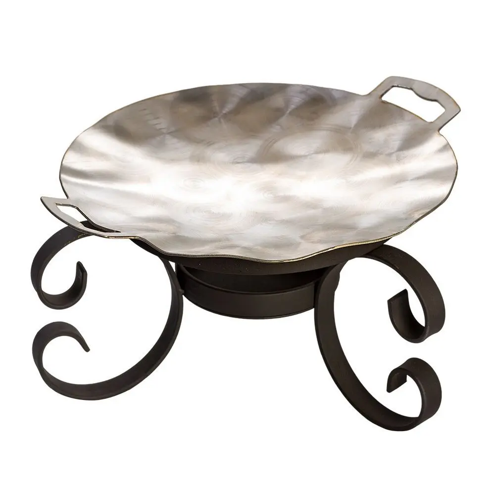 Подставка предназначена для подачи готового блюда в металлическом садже на стол и поддержания его горячим. В подставке есть специальная емкость для углей, свечи или мармитного топлива, благодаря которым пища при подаче на стол не остывает, и гости получают максимум удовольствия от ее великолепного аромата. К тому же, такая подача эффектно выглядит на столе!