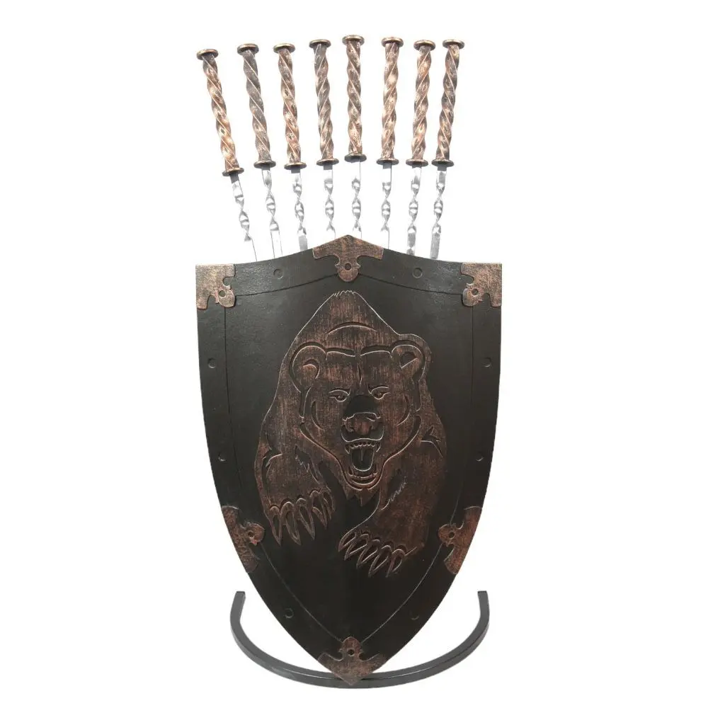 Подставка под шампуры и каминные принадлежности в виде щита с изображением “Медведь с лапами”.