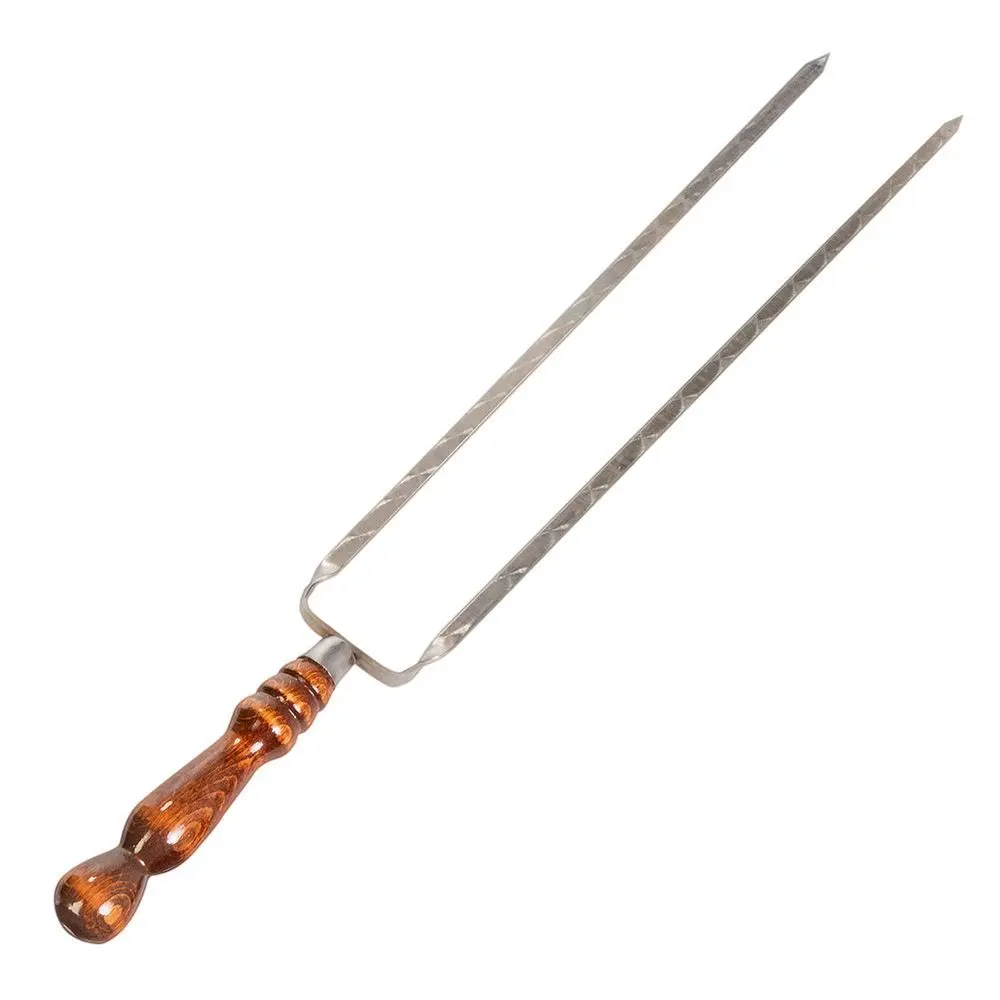Шампур двойной с деревянной ручкой – предмет, который прекрасно подходит для приготовления тушки птицы или стейков на даче или на пикнике за городом. Такой шампур обеспечивает двойную фиксацию нанизанных кусочков. Деревянная ручка делает шампур лёгким, не нагревается, покрыта защитным лаком и её приятно держать в руке.