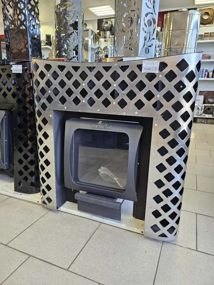 Декоративный экран Grill`D изготавливается из исключительно прочных и качественных материалов. Данный аксессуар служит как защита прилегающих конструкций топливного канала от грязи, а также прекрасно дополняет и украшает банную печь. Размещается рамка вокруг дверки топки в смежном помещение от парной.