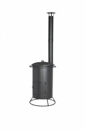 Печь под казан с трубой малая предназначена для приготовления пищи под открытым небом, благодаря тому, что печь под казан имеет высокую вытяжную трубу самоварного типа. Дым, выходящий из трубы, не мешает окружающим. Колосниковая решётка, выполненная из чугуна, выдвижным зольным ящиком позволяет удалить золу при работающей печи. Так же выдвижной зольный ящик дает возможность регулировать интенсивность горения дров в топке.