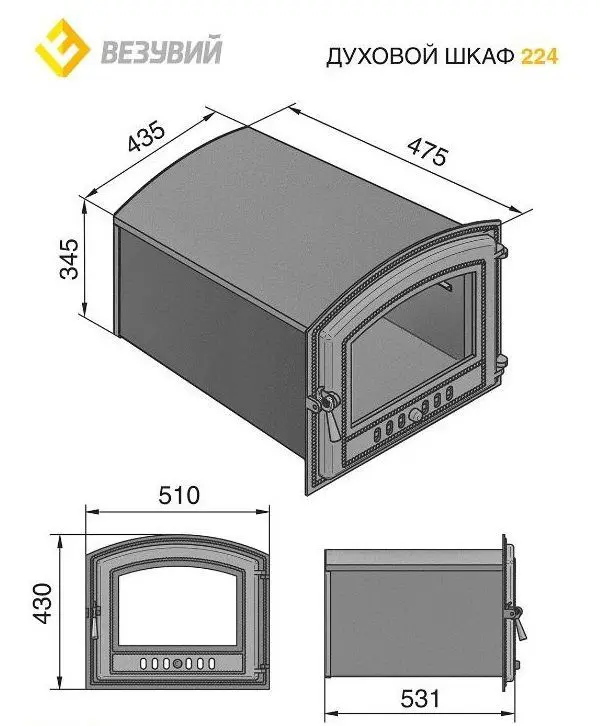 Духовка фирмы Везувий представлена в цвете антрацит. Модель изготавливается из комбинации чугуна и стали, дверца выполнена из чугуна, а корпус сделан из стали. Духовой шкаф устанавливается в кирпичную печь или мангал и предназначен для приготовления и разогрева пищи.Герметичная дверка