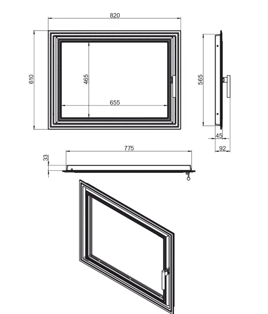 Двери изготовлены из качественного чугуна по ГОСТ 1412-85, производятся в комплектациях с глухим полотном или стеклом. Ручки дверей также сделаны из чугуна.