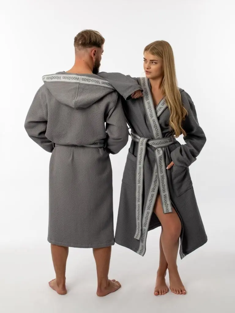 Халат средней плотности из 100% премиум хлопка декорирован логотипом Woodson на планке и поясе. Вафельный халат с рисунком звёздочка дополнен накладными карманами. Модель халата идеальна для отдыха после бани как мужчинам, так и женщинам. Соответствие товара европейским нормам безопасности подтверждено международным сертификатом